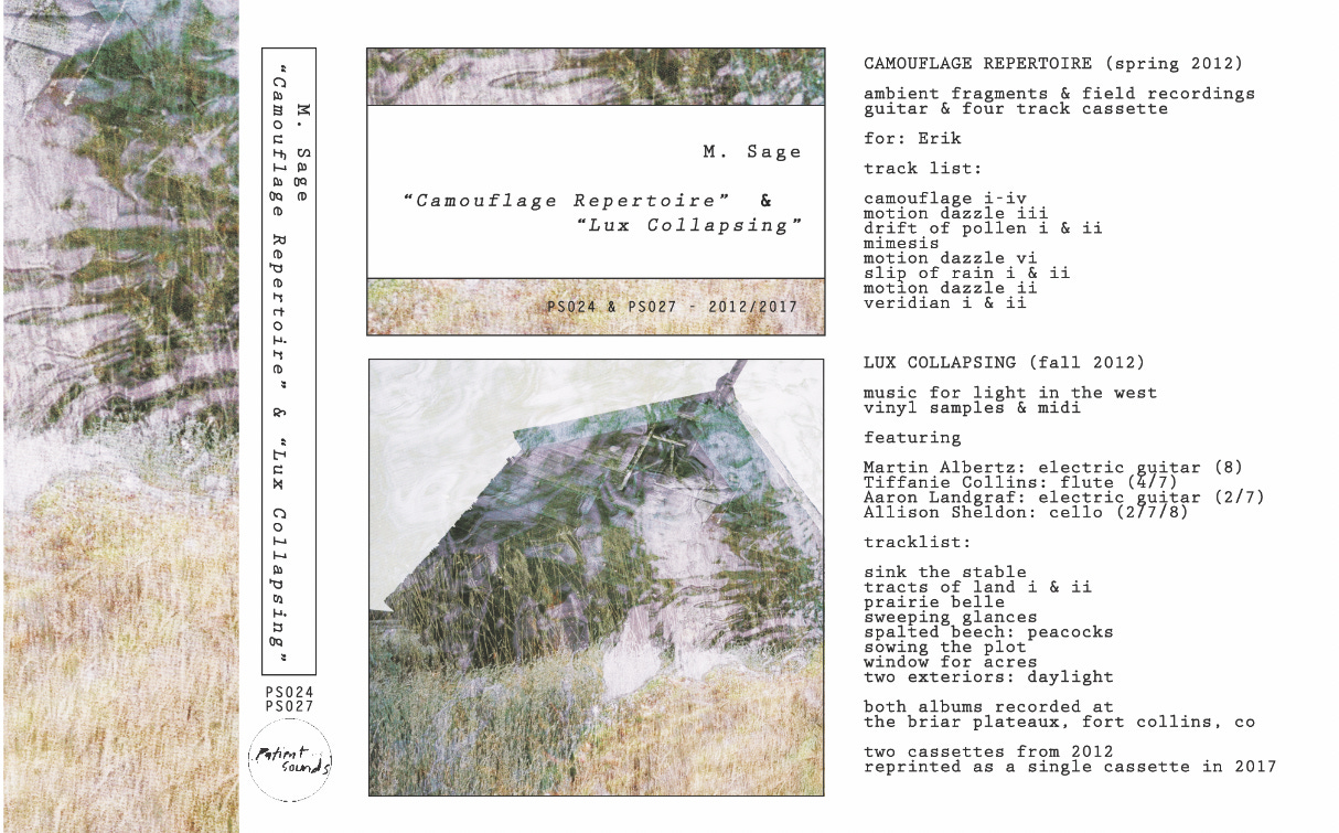 This album was originally issued on Patient Sounds as a cassette edition of 50 homedubbed tapes in 2012. I also did some lathe cut editions with Meep Records… a microscopic run really. Later, for a five year anniversary, I re-released Lux Collapsing on a double-loaded cassette where one side was Lux and the other had the album Camouflage Repertoire (maybe I will reissue Camouflage Repertoire eventually too…). Both were from the same era, and got a 5 year pro-dubbed treatment.